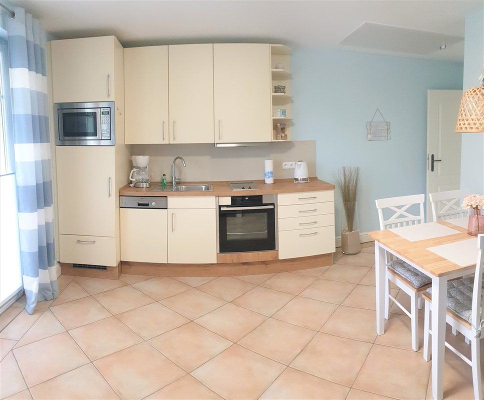 Die Küchenzeile ist mit Kühlschrank incl. Gefrierfach, Geschirrspüler, Kochfeld, Backofen und Mikrowelle ausgestattet.